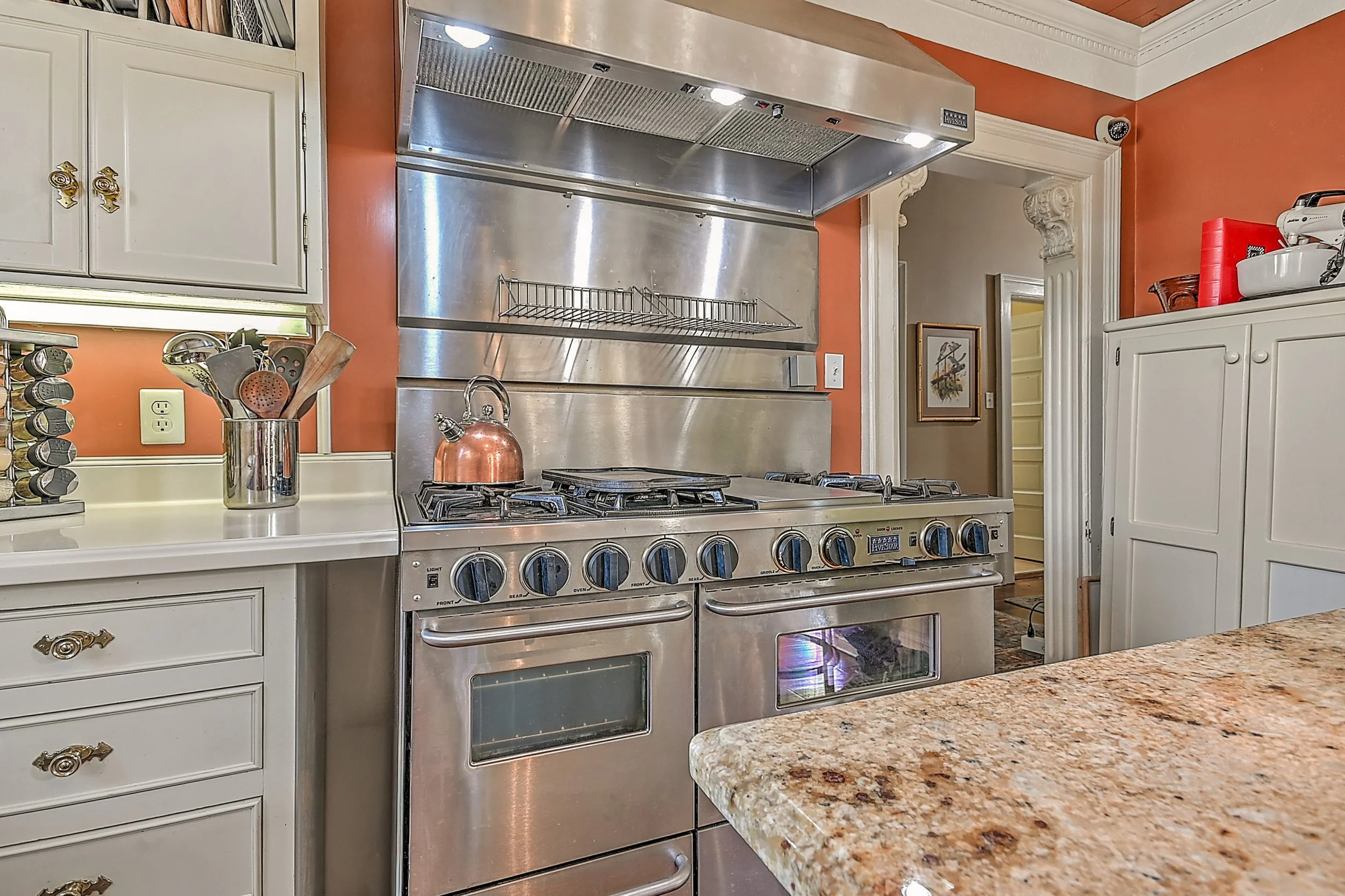 Step inside and you'll find the perfect blend of old-world craftsmanship and modern sophistication. The gourmet kitchen is a showpiece—thoughtfully updated with custom cabinetry, a matching Sub-Zero refrigerator, uncut marble countertops, coffered ceilings, and a deep farmhouse sink overlooking the gardens. A gas range and working fireplace make this space ideal for both serious cooking and casual entertaining.