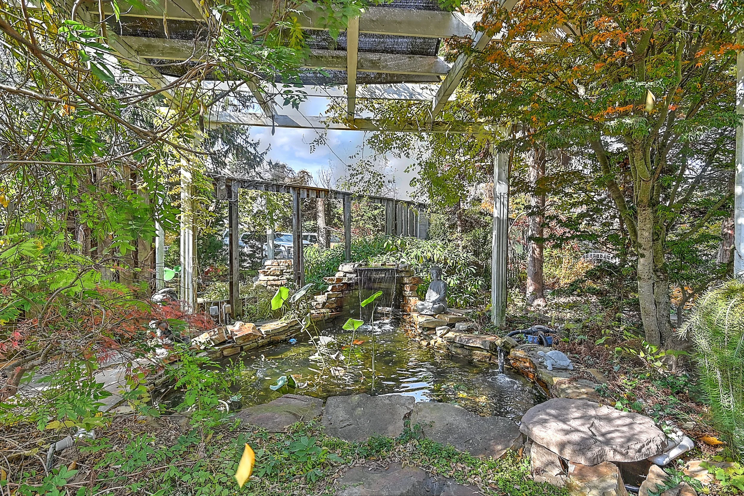 Outside, the property unfolds like a garden painting—stone pathways, mature trees, and an array of flowering plants surrounding a koi pond with lotus blooms. A gazebo and patio provide gathering spaces, while a formal rose garden and large garden shed invite the hands of a dedicated gardener.
